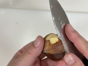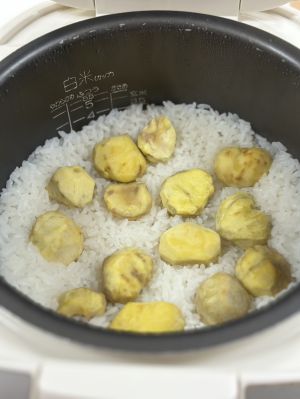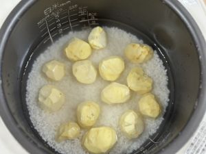 (3)洗米した米を炊飯器に入れ、メモリに合わせて水を入れ、塩とみりんを入れ、混ぜて最後に栗をのせます。