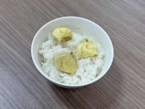 (5)茶碗にもり、お好みで黒ゴマを振ったら完成です。