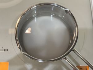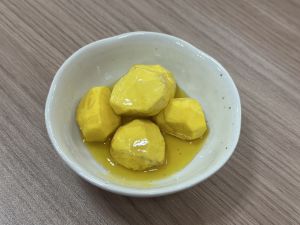 (5)栗に火が通ったら、みりんと塩、くちなしを入れ、10分ほど煮て、色を煮だします。