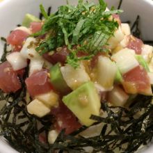 カップ(またはお茶碗)の中で寿司を作って、しょうゆ糀で味付けしたコロコロの材料をのせてたべましょう!今回はまぐろですが、何でもOK!いろいろ作ってみよう♪ご飯茶碗2杯~ 北川村のすし酢適量 まぐろ刺身用50~60g アボカド1/2個 長芋5㎝長さ しょうゆ糀大さじ1~2 もみのり・いりごま少々 お好みでマヨネーズ少々