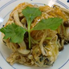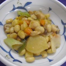 オイスターソースとごま油で中華風の味です。鶏ささみ1本 水煮大豆150g 茹でたけのこ50g 人参3~4cm しいたけ2~3枚 長ねぎ1/2本 生姜の薄切り2~3枚 A 醤油、オイスターソース各大さじ1弱 B 酒大さじ1 B 砂糖小さじ1 B だし汁300ml 水溶き片栗粉、ごま油