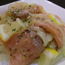 新玉ねぎのおいしい季節におすすめのマリネです☆サーモン(生食用)100g 新玉ねぎ1個 レモンスライス(1/8カット)適量 パセリ(みじん切り)適量 マリネ液 レモン汁、EVオリーブ油各大さじ2 粒マスタード小さじ2 砂糖、塩、こしょう各少々