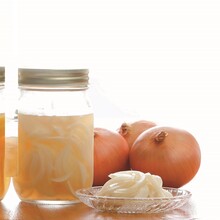 『お酢の力』パンフレットの紹介レシピ。お酢に漬けることで、食べやすく使いやすくなります。そのまま食べても、サラダに魚介に和えてマリネにしたり、お肉炒めにも使えます。玉ねぎ200g 米酢200cc はちみつ大さじ1 塩小さじ1/3