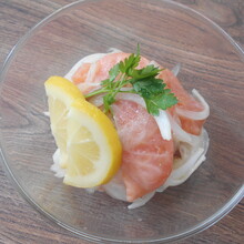 レモン酢を使ってアレンジメニュー。簡単和えるだけで1品出来上がり。新玉ねぎ1/4個 サーモン(切り落し)60g (A)レモン酢大さじ2 (A)オリーブオイル大さじ1 (A)塩こしょう少々 お好みのハーブ(パセリやディル)少々 レモン酢のレモン1切れ
