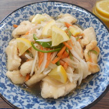 レモン酢を使ってさっぱり南蛮漬け。野菜もたっぷり食べれる一品です。鶏むね肉1枚(250g) 新たまねぎ1/2個 にんじん3cm ピーマン1個 酒大さじ1 片栗粉大さじ2 (A)レモン酢大さじ4 (A)醤油大さじ2 (A)砂糖大さじ1 油大さじ2~3 レモン酢のレモン1切れ