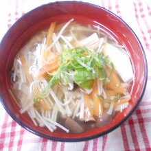 きのこを沢山使いあっさりとしたスープを作りました。エリンギ(大)1本 えのき1/4株 水600cc 和風だしの素1ステック 醤油、みりん各小さじ1/2 青ねぎ1本