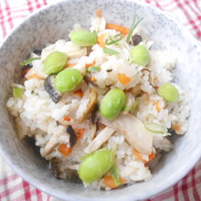 一汁一菜に。永谷園松茸のお吸い物の素を使い炊き込みご飯を作りました。お米2合 エリンギ(大)4本 人参1/3本 油揚げ1/2枚 冷凍枝豆少々 永谷園松茸のお吸い物の素3袋 水2合分