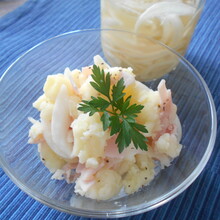 マヨネーズを使わないあっさりとしたポテトサラダです。じゃが芋2個(120g) ハム2枚 玉ねぎ酢(つけ汁)大さじ2 玉ねぎ酢の玉ねぎ30g 黒コショウ少々 パセリ少々