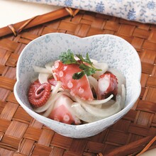 『お酢の力』パンフレットの紹介レシピ。玉ねぎ酢を使って切って和えるだけの簡単アレンジメニュー。タコ(刺身用)100g 玉ねぎ酢50g 玉ねぎ酢のつけ汁大さじ2 オリーブオイル大さじ1 塩ひとつまみ 粗びき黒コショウ少々 イタリアンパセリ少々