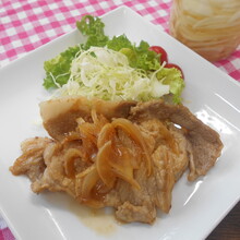 玉ねぎ酢を使ってアレンジメニュー。豚肉を焼く前に酢につけることで柔らかくなります。豚肉生姜焼き用160g 玉ねぎ酢50g 玉ねぎ酢のつけ汁大さじ2 (A)醤油大さじ2 (A)砂糖大さじ1/2 (A)みりん大さじ1 (A)すりおろし生姜小さじ1 油大さじ1 付け合わせ野菜(レタス、キャベツ、トマトなど)適量