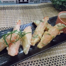 ピエトロドレッシングうめで簡単にもう一品♪【食育・夏休みお助け隊】かに風味かまぼこ1パック 天ぷら粉・水適量 揚げ油適量 ピエトロドレッシングうめ適量 大葉(刻む・もしくはちぎる)3枚程度