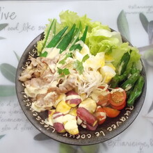 ペイザンヌサラダとは、フランスで親しまれる『田舎風サラダ』卵等と野菜を組み合わせたカジュアルサラダです。窪川麦豚しゃぶしゃぶ用うす切り肉100㌘ さつま芋1本(120~140㌘) オクラ3本 ししとう6本 ミニトマト3個 高知県春野産サラダで食べる新生姜1かけ みょうが1個 レタス2~3枚 ゆで卵1個 塩・こしょう・こめ油適量 キユーピーペイザンヌサラダドレッシング適量