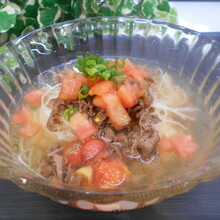 やすまるだし2袋 水600cc そうめん100g 牛肉切り落とし100g トマト100g (A)焼肉のたれ大さじ2 (A)酒大さじ2 (A)砂糖小さじ1/2 刻みねぎ適量