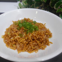 焼そばめん1袋 ごはん100g 豚バラ肉50g キャベツ50g 玉ねぎ50g いか天入り天かす天華10g オタフク焼そばソース大さじ3 オタフクお好みソース大さじ2 こめ油小さじ2 塩・コショウ少々