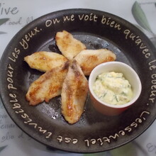 お多福たちまちうまい酢を使って♪オタフク社員おすすめ!高知県ご当地レシピ♪シイラ切身(骨とり)130~200㌘ 塩・こしょう・高知県産米粉適量 バター1/3(チューブ)10㌘ (A)お多福たちまちうまい酢大さじ1 (A)ゆでたまご1個 (A)大葉5枚 (A)みょうが1本 (A)マヨネーズ大さじ3