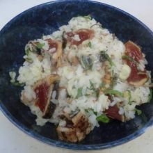 米2合 昆布だしの素スティック状の1/3程度 鰹のタタキ1/2節~ ミョウガ2個 大葉5枚 いりごま適量 青ねぎ適量 (A)みりん大さじ1 (A)醤油大さじ2 (A)おろし生姜小さじ1 寿司酢60cc