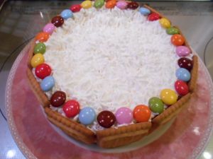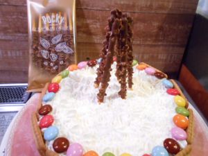 (2)全体にクリームを薄くぬって側面はクッキーを飾り付ける。周りにはマーブルチョコを置いていく。