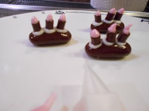 ★キャンドルはガルボにホワイトチョコペンでベビーチョコを3つ飾り付け、ピンクのチョコペンで火を作る。
